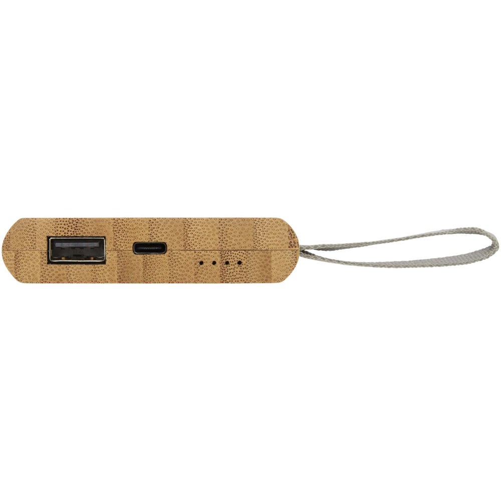 Bamboe powerbank die 5000 mAh back-upstroom biedt voor mobiele telefoons of andere digitale apparaten. Met ledlampjes en een webbing gemaakt van RPET-materiaal. Type-C-oplaadkabel inbegrepen. Verpakt in een geschenkverpakking en geleverd met een gebruiksaanwijzing (beide gemaakt van duurzaam materiaal). Aangezien bamboe een natuurlijk product is, kan ieder item enigszins variëren in kleur.