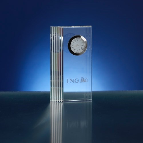 Omschrijving: Klokje van glas/kristal. Uw logo en/of tekst kan in het glazen gedeelte gegraveerd worden - Afmeting: 6x2x10cm - Min.order:30 - Levertijd:4 weken - Tag: relatiegeschenk, klok, bureau accessoires, kristal, design, office, executive