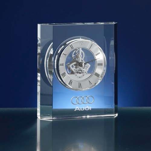 Omschrijving: Een design klok van glas met doorzichtig uurwerk. Uw logo of tekst kan op het glas gegraveerd worden - Afmeting: 14,2x4x16cm - Min.order:30 - Levertijd:4 weken - Tag: relatiegeschenk, klok, bureau accessoires, kristal, design, office, executive