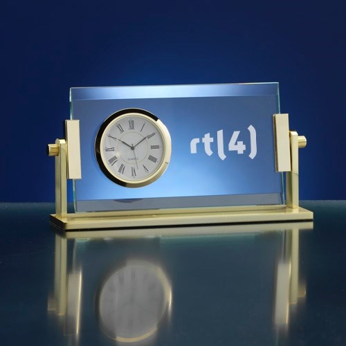 Omschrijving: Design klok in goudkleur. Op het glas kan een logo of tekst geplaatst worden. - Afmeting: 178x42x90mm - Min.order:100 - Levertijd:4 weken - Tag: relatiegeschenk, klok, bureau accessoires, kristal, design, office, executive